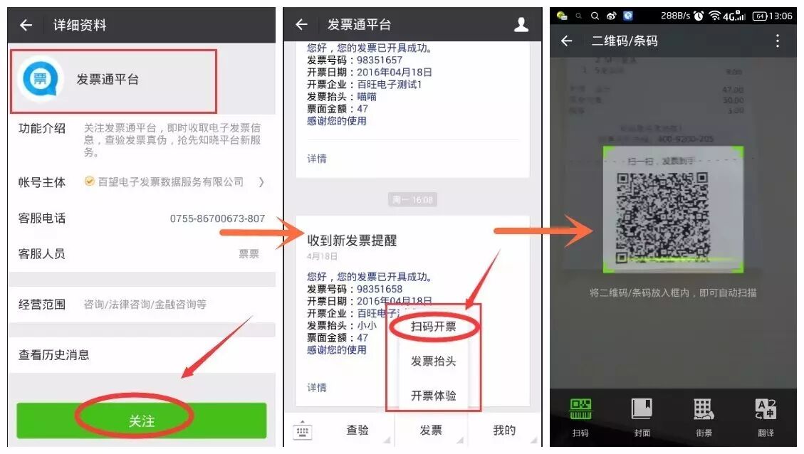 百望电子发票数据服务有限公司目前正积极地与连锁门店合作,在购物小票上添加发票二维码,消费者使用发票通微信公众号fapiaotong的“扫码开票”功能或直接微信“扫一扫”,就可自行发起开票。